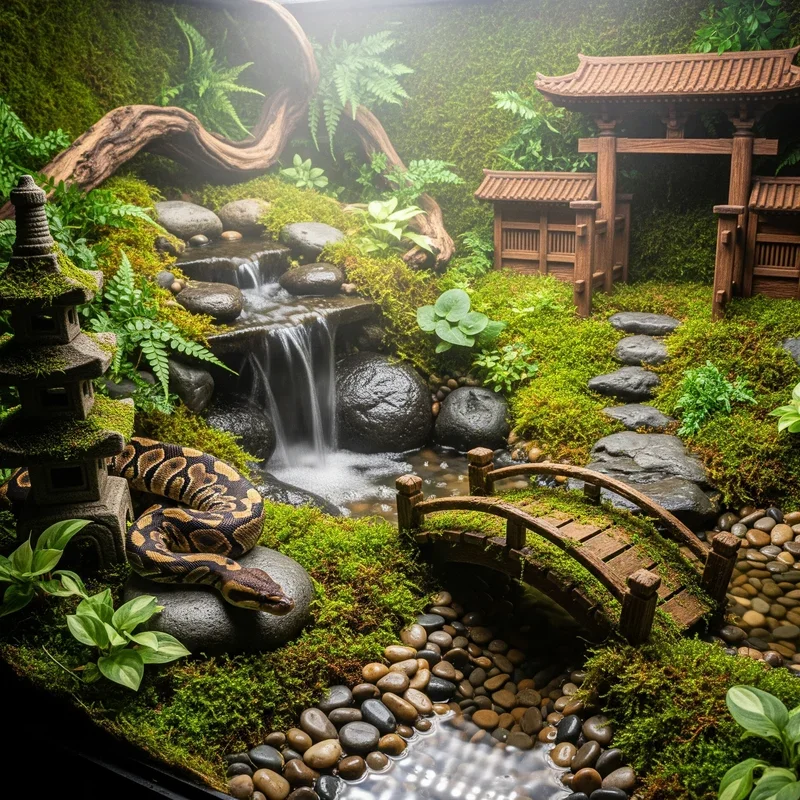 Transport your ball python to a serene Asian temple setting with zen-inspired design elements! Include miniature pagoda structures as unique hiding spots with multiple entrance points. Add bamboo elements and artificial bonsai trees for authentic Asian garden aesthetics. Create a sand garden area with patterns that won't disturb your snake's movement but add visual appeal. Include a small bridge over the water bowl, turning necessary features into decorative elements. The organized, peaceful environment promotes calm behavior in both snake and observer. Use subtle lighting to highlight architectural elements while maintaining proper day/night cycles. This sophisticated setup brings tranquility to your space while housing your python beautifully.