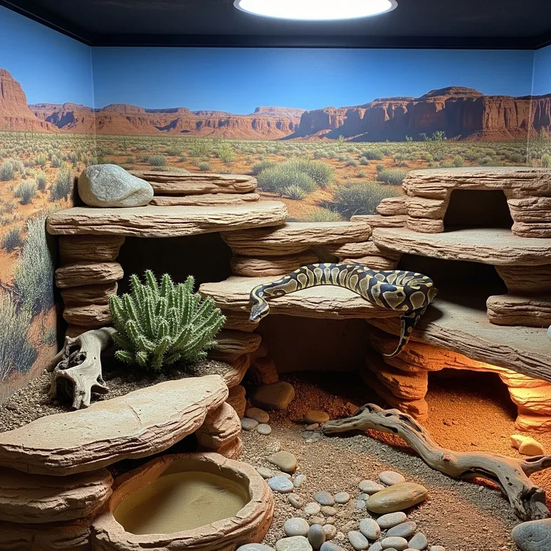 Design an elaborate network of interconnected rock caves that satisfies your ball python's love for tight, secure spaces! Stack slate, shale, or artificial rock pieces to create multiple caves at different temperature zones. Build tunnels between hiding spots using PVC pipes covered in textured material for natural appearance. Ensure each cave has slightly different dimensions, giving your snake options based on their mood. The rocky landscape provides excellent heat retention for maintaining proper temperature gradients naturally. Include observation windows using clear acrylic panels to watch your snake without disturbing them. This setup reduces stress by offering numerous secure retreats while maintaining visual interest. Your python gains confidence through having complete control over their visibility and security.