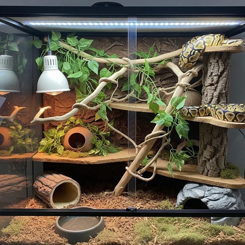 Create distinct zones within your enclosure using a split-level design that maximizes usable space creatively! Build a raised platform covering half the enclosure, creating an upper level and shadowy area below. Design the upper level as a basking area with optimal heating and light exposure. Transform the lower level into a cool, humid retreat with multiple hiding spots and water features. Connect levels with textured ramps or branches that provide easy navigation for your snake. The multi-level approach allows for greater temperature and humidity gradients in limited space. This design particularly suits taller enclosures where horizontal space might be limited. Your ball python enjoys choosing between completely different environments within one habitat.