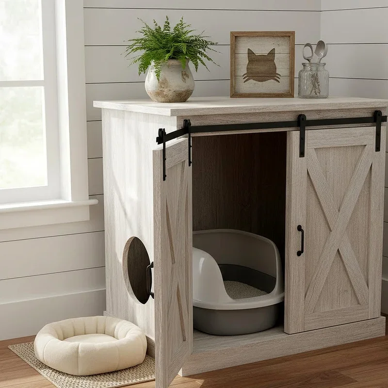 Bring rustic charm to your home with a farmhouse-style barn door cabinet that houses your cat's litter box while adding that coveted Joanna Gaines aesthetic. These cabinets feature sliding barn door hardware that's both functional and decorative, creating a focal point that enhances your room's design rather than detracting from it. The distressed wood finishes, metal accents, and classic farmhouse details like X-patterns or shiplap backing make these pieces Instagram-worthy additions to any space. Inside, there's ample room for a litter box plus storage for supplies, while the sliding doors make access easy without requiring additional clearance space. This style works beautifully in kitchens, mudrooms, or any space where you want to maintain that cozy, farmhouse feel throughout your home. The substantial construction ensures these pieces will last for years while maintaining their charming, weathered appearance.