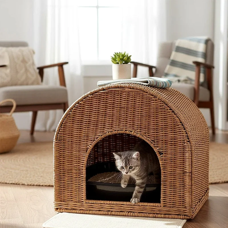 Bring a touch of bohemian charm to your space with a wicker basket litter box house that adds texture and warmth to any room's design scheme. These natural fiber enclosures blend seamlessly with coastal, boho, or traditional decor styles while providing your cat with a cozy, private space for their needs. The breathable wicker material naturally allows for air circulation, helping to prevent the buildup of odors that can occur with plastic enclosures. You can find these in various shapes and sizes, from dome-shaped hideaways to rectangular chest-style options that look like decorative storage baskets. Many feature removable cushions on top that can serve as an additional perch for your cat when they're not using the facilities below. The organic appearance makes these perfect for bedrooms or living areas where you want to maintain a relaxed, natural aesthetic.