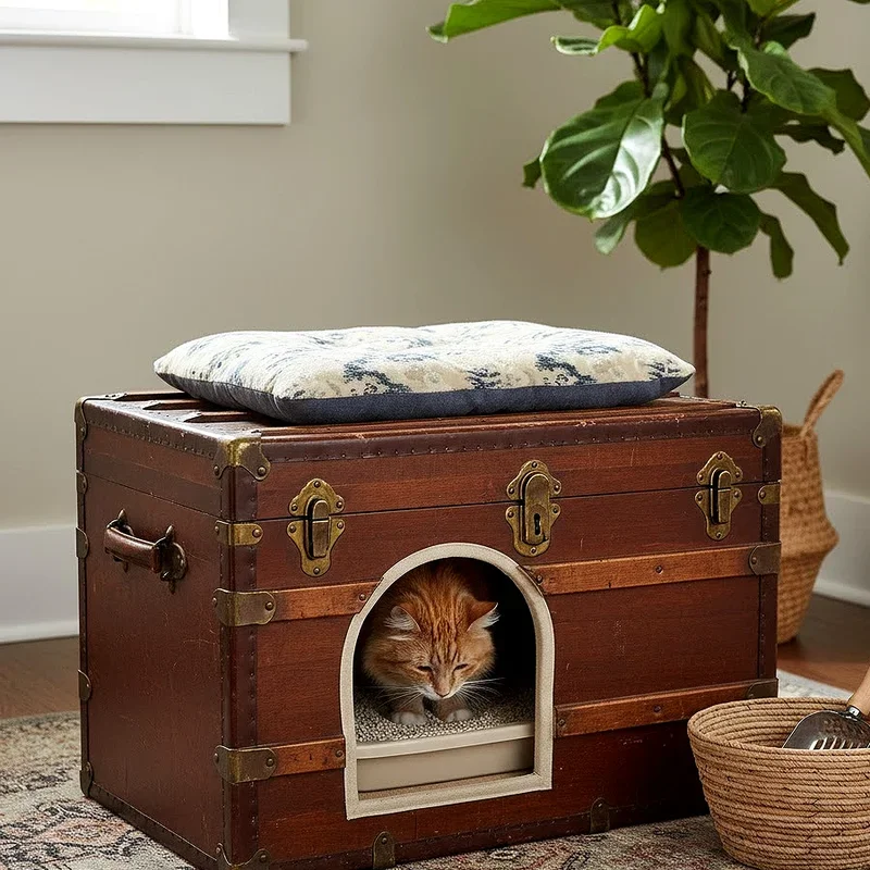 Give new life to an old trunk or find a vintage-inspired piece specifically designed to house a litter box while adding character to your space. These conversions maintain the classic appeal of vintage luggage or storage trunks while providing a hidden sanctuary for your cat's bathroom needs. The aged leather, brass hardware, and weathered wood details add instant personality to any room, especially those with industrial, rustic, or eclectic design themes. You can stack books or decorative items on top, using it as a coffee table or accent piece that tells a story. The hinged top makes cleaning incredibly easy, while the spacious interior accommodates even the largest litter boxes comfortably. This option is perfect for cat owners who love unique, one-of-a-kind pieces that spark conversation while serving a practical purpose in their homes.