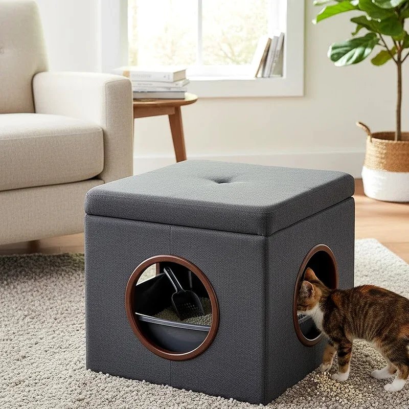 Combine comfort, storage, and discretion with an ottoman-style litter box that serves multiple functions while looking like a regular piece of living room furniture. These ottomans feature padded tops perfect for resting your feet or providing extra seating when guests arrive, while the interior cleverly conceals your cat's litter box. The design typically includes a side or front entrance for your cat, maintaining the ottoman's traditional appearance from most angles in your room. Many models offer additional storage compartments for blankets, magazines, or pet supplies, maximizing the functionality of this already versatile piece of furniture. Available in various fabrics and styles from tufted velvet to simple linen, these ottomans can match any decor scheme while serving their secret purpose. Your guests will never suspect that stylish ottoman is anything more than a comfortable footrest.