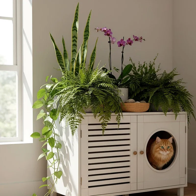 Why not combine your love for greenery with practical pet care by choosing a litter box enclosure that doubles as a plant stand? These clever designs feature a sturdy top surface perfect for displaying your favorite houseplants, creating a living piece of decor that serves multiple purposes. The enclosure below provides ample space for your cat's litter box while maintaining privacy and reducing scatter. You can style it with cascading pothos, elegant snake plants, or colorful succulents to match your room's aesthetic. This solution works particularly well in living rooms or bedrooms where you want to maintain a natural, organic feel. The combination of plants and enclosed litter space also helps naturally filter air and reduce any potential odors, creating a win-win situation for both you and your feline friend.