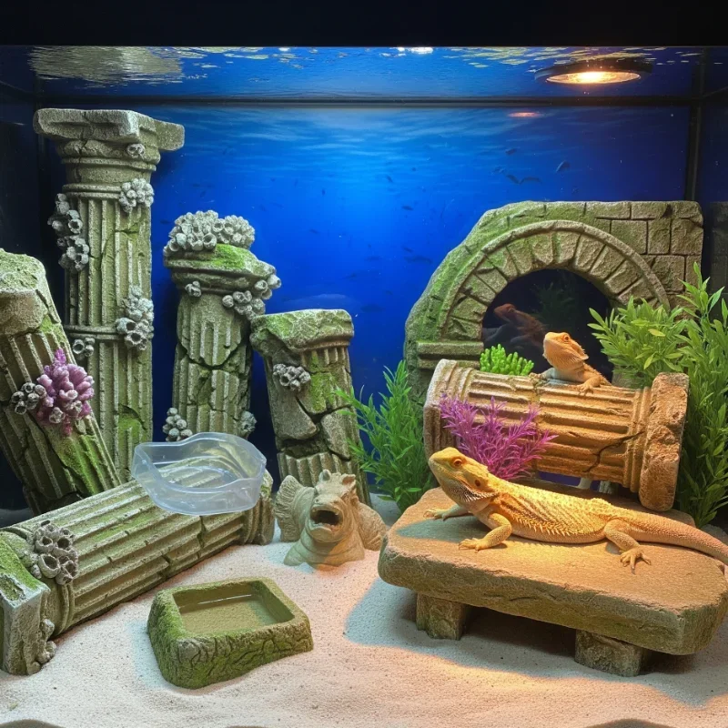 Design an aquatic-themed habitat without water by creating the illusion of ancient underwater ruins where your bearded dragon reigns as the guardian of lost treasures. Use blue-tinted substrate or sand to simulate ocean floor, and position Greek-style columns and broken pottery pieces (sealed and smooth-edged) throughout the tank. Add artificial seaweed and kelp that sways slightly from the ventilation, creating movement that mimics underwater currents without adding humidity. Include treasure chest hides and pearl-like decorations scattered throughout, making your beardie look like they're protecting ancient maritime secrets. Strategic blue LED lighting enhances the underwater effect during evening hours while maintaining proper day/night cycles for your pet's health. This imaginative setup provides standard habitat functionality while creating an enchanting scene that captures everyone's attention.
