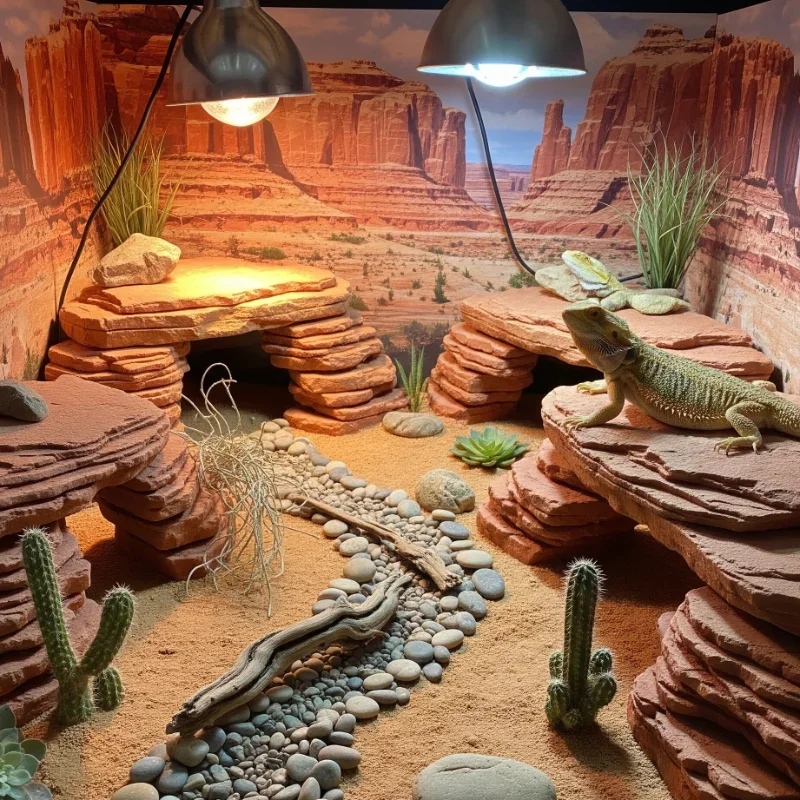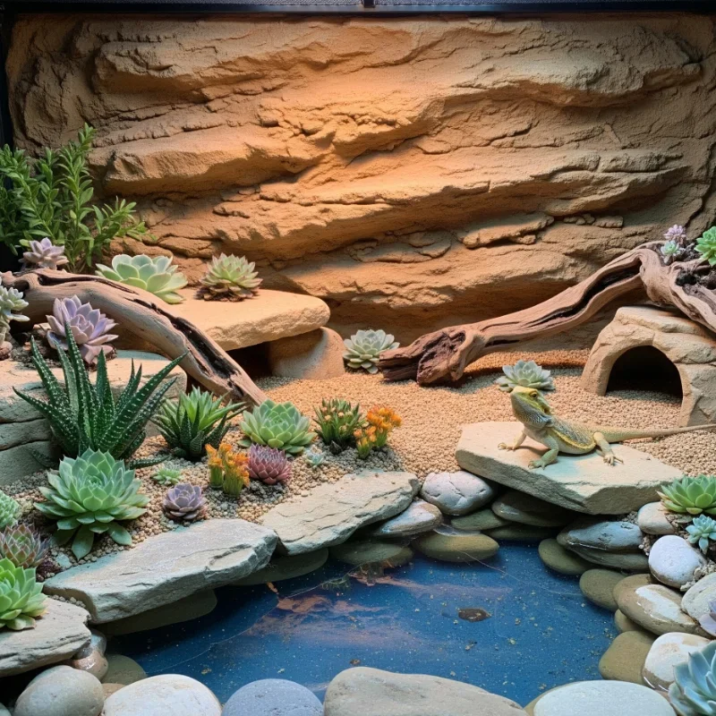 Build a Wild West landscape complete with canyon walls, desert plateaus, and frontier-themed decorations that make your bearded dragon the sheriff of their own town. Stack red sandstone to create dramatic canyon walls along the back and sides, leaving the front open for clear viewing and easy access. Add miniature cacti replicas, wagon wheel decorations, and a small "watering hole" to complete the frontier atmosphere while maintaining safety. Create different elevation zones using flat rocks to simulate mesas and valleys, providing temperature gradients and exercise opportunities as your dragon travels between levels. Position a hollow log as the "saloon" hide, and use tumbleweed-safe dried grasses for authentic Western texture. This theme combines natural desert elements with playful decorative touches that make routine habitat maintenance feel like exploring the Old West.