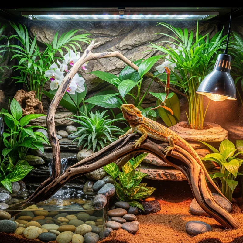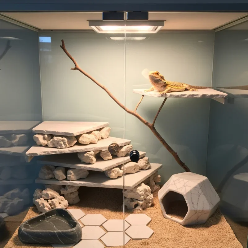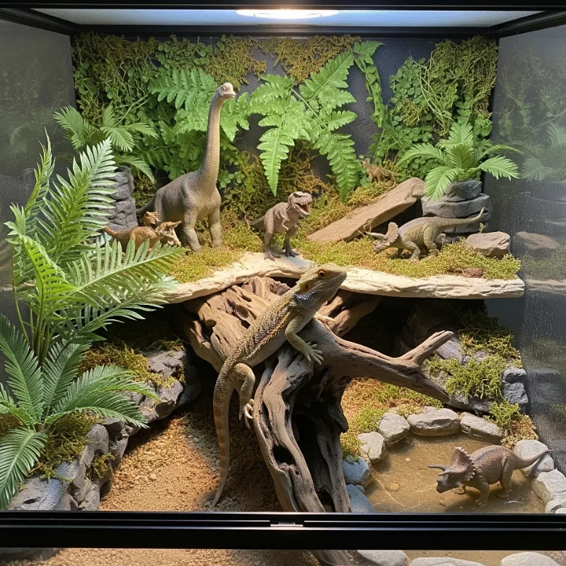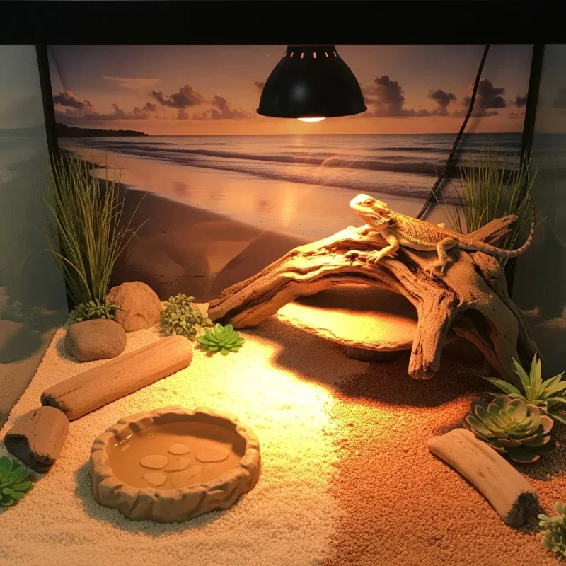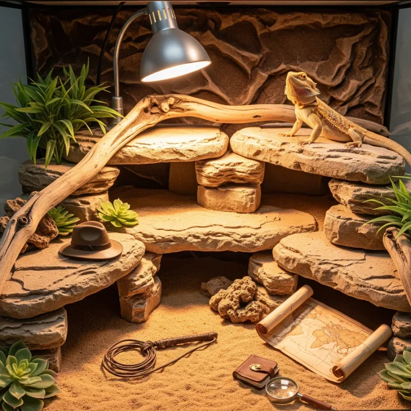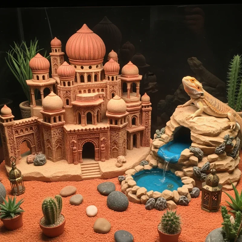 Transport your bearded dragon to an exotic Arabian palace setting using ornate hides designed like miniature desert temples and golden-toned decorations throughout the enclosure. Create architectural interest with resin columns and arches that serve as basking platforms while adding vertical elements reminiscent of ancient Middle Eastern palaces. Use fine sand in warm golden hues and incorporate silk fabric drapes (securely fastened) in jewel tones to create mysterious alcoves and shaded retreats. Add ceramic oil lamp replicas and ornate water dishes that look like palace fountains to complete the thousand-and-one-nights atmosphere. Position smooth, sun-bleached rocks to create a courtyard effect where your dragon can bask like royalty in their desert kingdom. This unique theme provides standard habitat functionality while creating a conversation-starting display that showcases your creativity and your pet's regal nature.