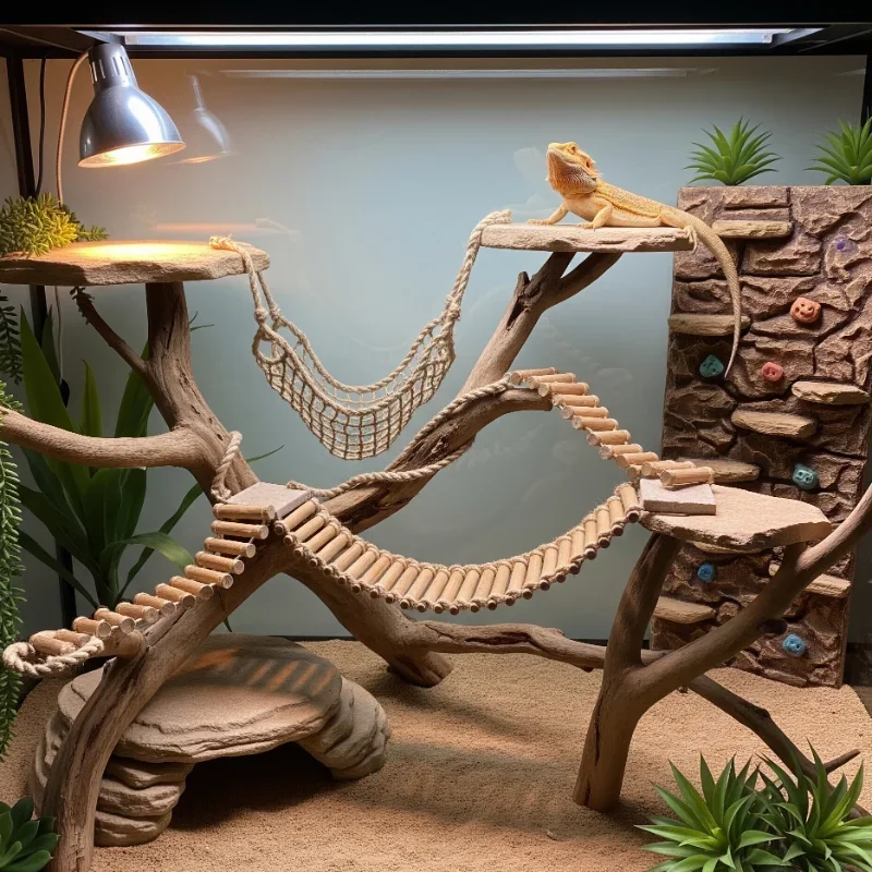 Design an exciting jungle gym for your bearded dragon using a combination of branches, ropes, and platforms that encourage natural climbing and exploration behaviors. Install thick branches at various angles, creating highways throughout the tank that connect different areas like the basking spot, feeding station, and hide boxes. Add reptile-safe rope bridges and hammocks at mid-level heights, giving your beardie multiple lounging options with different temperature zones. Incorporate bendable vines that you can reshape periodically to keep the environment fresh and stimulating for your curious pet. This setup promotes exercise and mental stimulation, helping prevent obesity and boredom-related behaviors that can develop in sedentary dragons. Watch your beardie's personality shine as they navigate their personal obstacle course, developing preferences for certain routes and favorite perching spots.