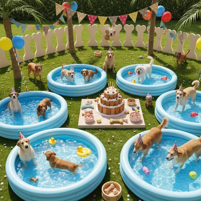 Beat the heat with a splashing good time at a pool party designed specifically for your water-loving pup and their friends! Set up multiple kiddie pools at different depths to accommodate various swimming abilities and comfort levels. Create a tropical paradise with inflatable palm trees, beach balls, and floating toys that encourage water play. Provide life jackets for dogs who aren't strong swimmers but still want to join the aquatic fun. Set up a "dry zone" with shade tents for pups who prefer watching the action from poolside. Organize pool games like fetch with floating toys or a doggy diving contest for the bravest swimmers. Have plenty of towels ready and consider setting up a grooming station for post-swim cleanup. Serve frozen treats like ice cube surprises with treats frozen inside to keep everyone cool.