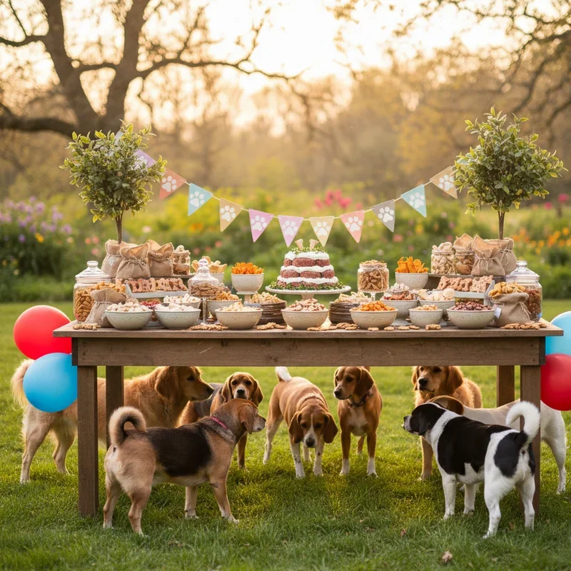 Design an impressive treat bar that rivals any human dessert table with an array of dog-safe delicacies! Arrange treats at different heights using cake stands, boxes, and platters to create visual interest and accommodate various dog sizes. Label each treat with ingredients for owners concerned about allergies or dietary restrictions. Include options like homemade training treats, dehydrated meats, veggie chips, and special birthday cookies. Set up a "decorate your own cookie" station with dog-safe icing in squeeze bottles for creative customization. Provide small paper bags or boxes so guests can create take-home treat bags as party favors. Include a water station with flavored broths or goat milk for special birthday toasts. Keep portions small to prevent upset stomachs and ensure every pup can sample multiple options without overindulging.