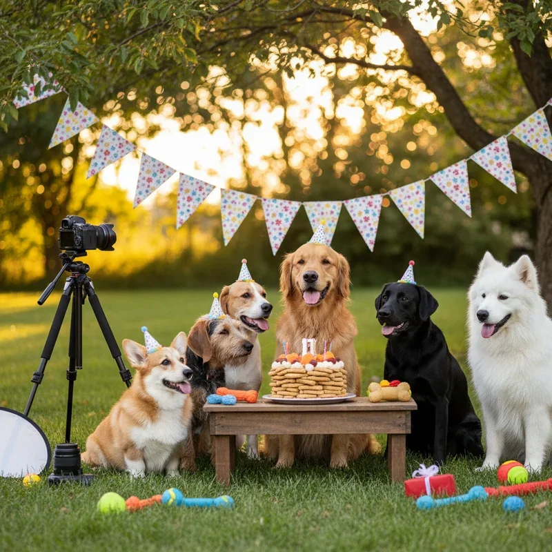 Create lasting memories with a DIY photo booth that captures all the birthday magic and silly moments! Design a backdrop using streamers, balloons, and a personalized birthday banner featuring your dog's name and age. Provide props like oversized sunglasses, birthday hats, bow ties, and signs with funny sayings like "Birthday Boy" or "Party Animal." Set up good lighting with ring lights or position the booth near natural light for flattering photos. Use a smartphone tripod with a remote clicker or timer so you can jump in photos with your pup. Create a hashtag for the party so guests can share their photos and you can collect them all later. Print instant photos as party favors that guests can take home as keepsakes. Consider hiring a pet photographer for an hour to ensure professional-quality shots of the celebration.