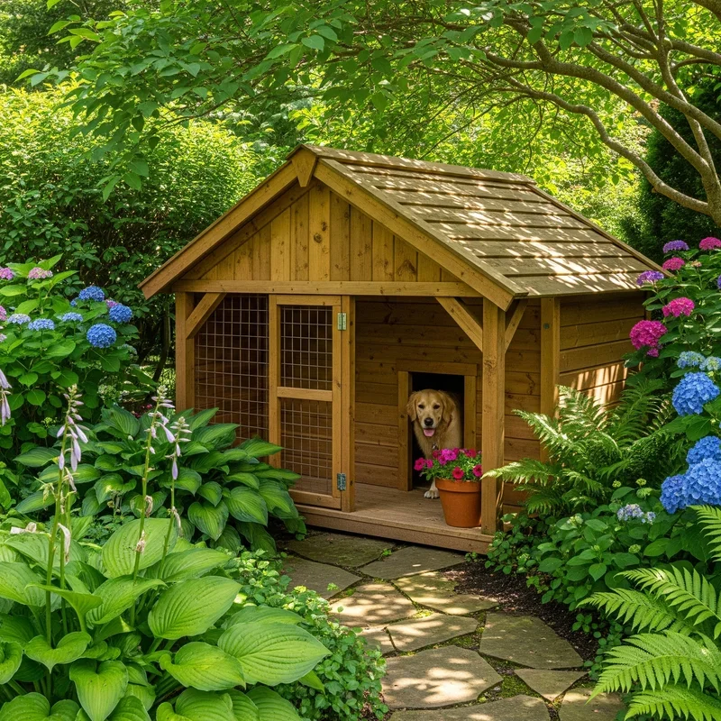 Transform an existing shed or build a new one specifically designed as a deluxe dog dwelling that offers indoor-outdoor living! This substantial structure provides climate control possibilities, storage for supplies, and enough space for multiple dogs if needed. Install windows for natural light and ventilation while maintaining security with sturdy locks and reinforced doors. Add insulation and heating/cooling options to ensure year-round comfort regardless of weather extremes. Include a dog door connecting to a fenced yard area, giving your pup autonomy over their indoor-outdoor access. The extra space allows for separate sleeping, eating, and play areas, mimicking a natural den environment. Paint the exterior to match your home and add landscaping around it for an attractive backyard feature.