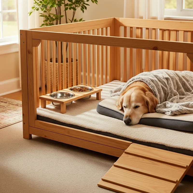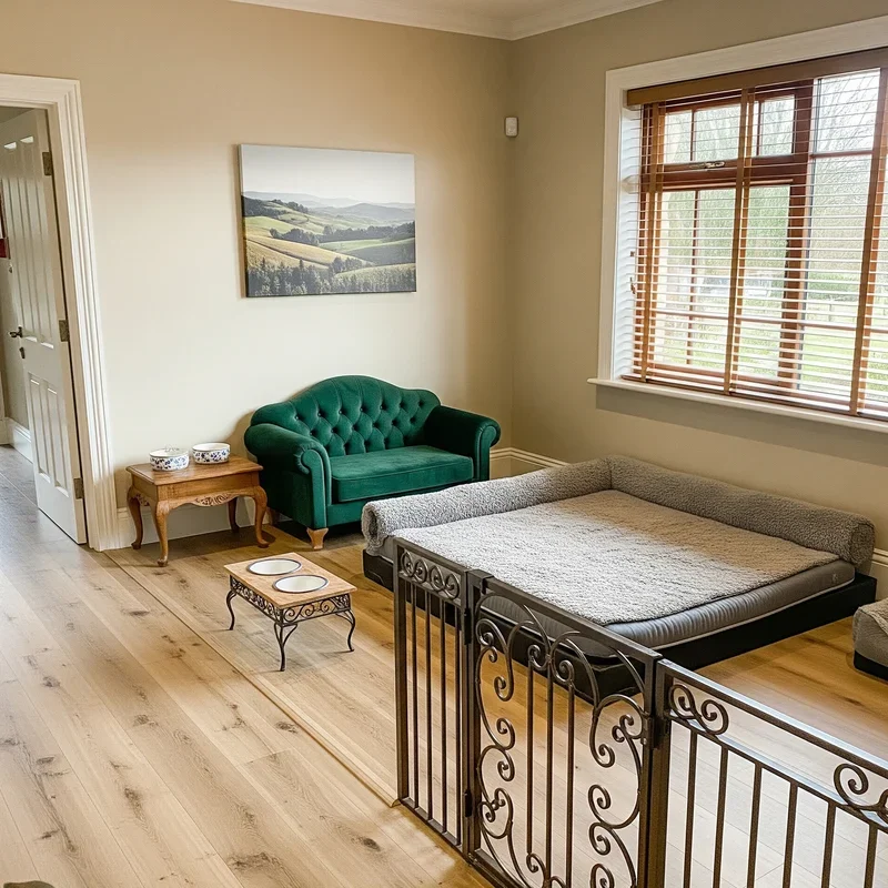 Create a specialized space addressing the unique needs of aging dogs with mobility issues and comfort requirements! Install ramps instead of steps, ensuring easy entry and exit for dogs with arthritis or hip problems. Use extra-thick orthopedic bedding that provides joint support and pressure relief during extended rest periods. Add non-slip flooring that gives uncertain paws confidence while preventing falls and injuries. Include night lights for dogs with declining vision, helping them navigate safely during bathroom breaks. Position food and water at elevated heights, reducing strain on necks and backs during meal times. The senior-focused design ensures your older dog maintains independence and dignity while receiving the support they need for comfortable golden years.