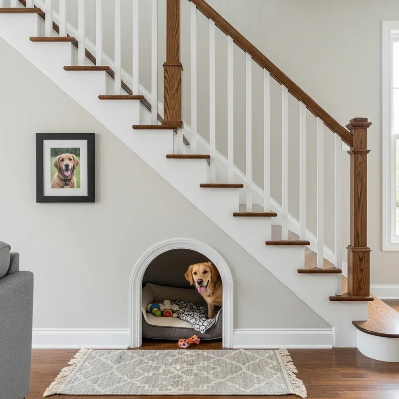 Utilize that awkward space beneath your stairs to create a custom dog sanctuary that feels like a natural extension of your home! This clever solution maximizes unused square footage while giving your dog a quiet, cave-like environment they instinctively love. Install a baby gate or decorative door to maintain easy access while ensuring security when needed. Add built-in food and water stations, toy storage, and even a small doggy door leading to the backyard. The slanted ceiling creates a cozy atmosphere perfect for anxious dogs who prefer enclosed spaces. Paint the interior with washable paint and install easy-clean flooring for simple maintenance. Include soft lighting on a timer to help your pup feel secure during evening hours. This permanent solution adds value to your home while providing your dog with their own special hideaway.