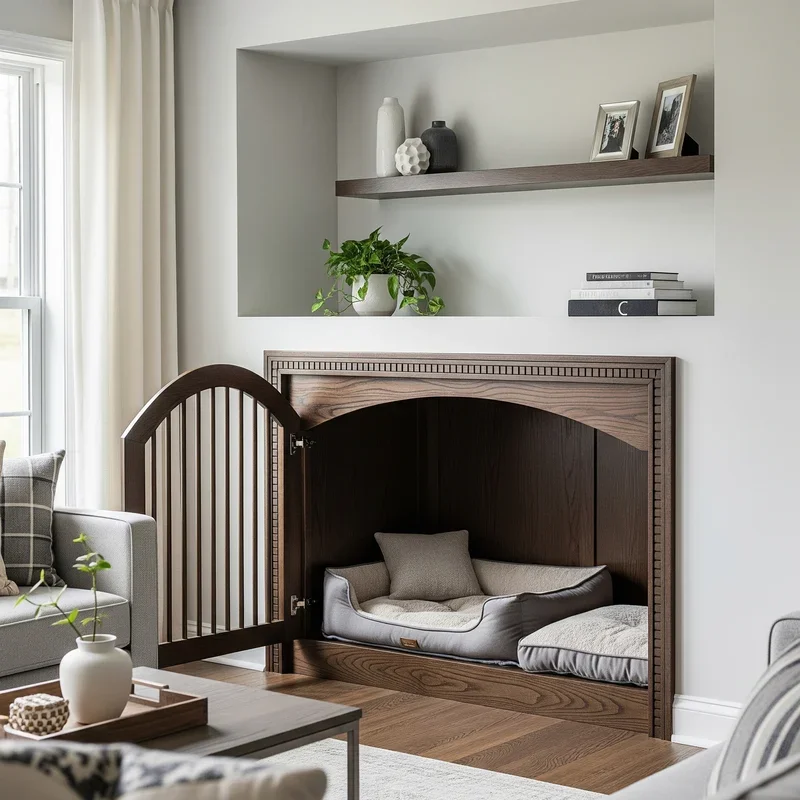 Create a seamless, space-saving solution by incorporating a kennel directly into your wall design during renovations or new construction! This innovative approach recesses the kennel into the wall cavity, maintaining your room's flow while providing your dog with a dedicated space. Frame it with decorative molding to match your home's architectural style, making it look intentional rather than added on. The built-in design prevents the kennel from being knocked over or moved by energetic dogs. Include ventilation grates that double as decorative elements while ensuring proper airflow throughout the space. Add a removable tray at the bottom for easy cleaning without dismantling the entire structure. This permanent fixture becomes part of your home's character while offering your dog a secure, comfortable retreat they can call their own.