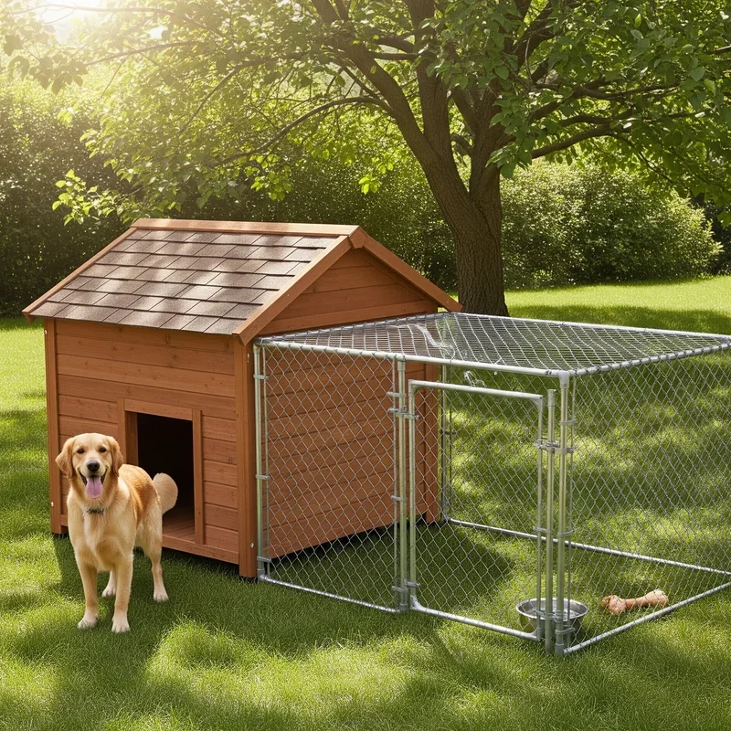 Blend your dog's space seamlessly into your landscape design, creating a kennel that enhances rather than detracts from your garden! Use decorative fencing that complements your garden style, whether wrought iron for elegance or bamboo for zen aesthetics. Plant dog-safe vegetation around the perimeter, providing natural shade and visual interest while avoiding toxic plants. Include raised garden beds along the edges where you can grow herbs or vegetables safely out of paw's reach. Design pathways with paw-friendly materials like smooth river rocks or rubber mulch that won't hurt sensitive feet. Add a water feature for drinking and play, creating a resort-like atmosphere your dog will love. This integrated approach makes the kennel feel like a natural extension of your outdoor living space.