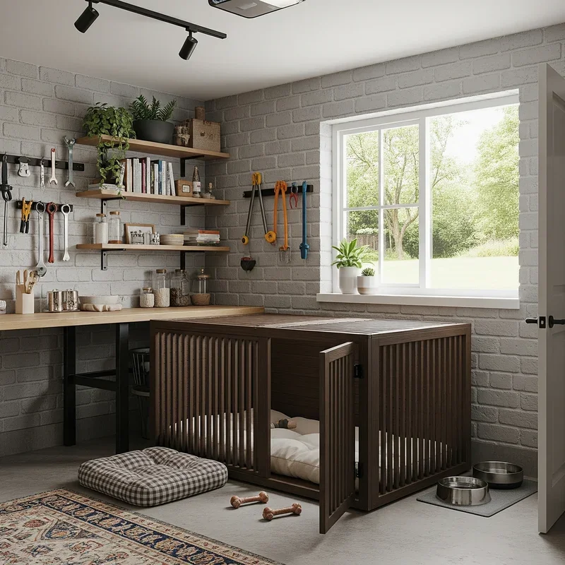 Transform part of your garage into a climate-controlled dog space that offers convenience and security without sacrificing your home's interior! Section off an area with proper ventilation, ensuring exhaust fumes never reach your dog's space. Install rubber flooring for comfort and easy cleaning while protecting the concrete from accidents and scratches. Add a doggy door to the backyard for independent access while maintaining garage security with proper barriers. Include storage solutions for food, toys, and supplies, keeping everything organized and easily accessible. The garage location provides a quiet retreat away from household chaos while keeping your dog close enough for regular interaction. This semi-outdoor solution works perfectly for dogs who prefer cooler temperatures or need separation from indoor pets.