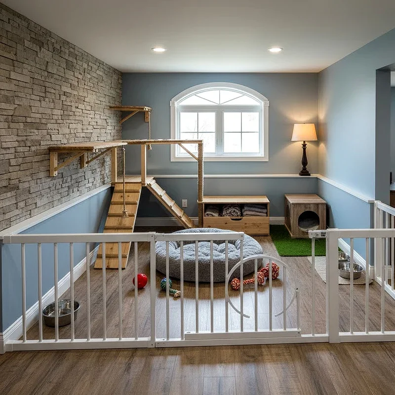 Got a closet you barely use? Convert it into your dog's private suite! Remove the doors or replace them with a decorative curtain for easy access. Paint the walls in calming colors and add battery-operated LED strips for gentle lighting. Install ventilation if needed and create levels with sturdy shelving for smaller dogs who enjoy climbing. This mini room can include a bed, toy storage, and even a small treat dispensing camera so you can check in remotely. The enclosed space appeals to dogs' natural desire for a den-like environment. Add personal touches like framed photos of your adventures together or a small chalkboard where you can leave daily "love notes" to your pup.