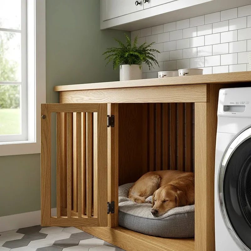 Your laundry room can pull double duty as a perfect dog retreat! Install a custom bed platform above your washer and dryer for small to medium dogs, or create a floor-level nook beside your machines for larger breeds. The white noise from running appliances can actually be soothing for anxious dogs. Add a folding gate to keep your pup secure during certain tasks while allowing them freedom when appropriate. Include wall-mounted food and water bowls to save floor space, and use the existing shelving to store dog supplies alongside your laundry essentials. This practical solution maximizes every square foot while giving your dog a space that feels intentionally designed for their comfort.