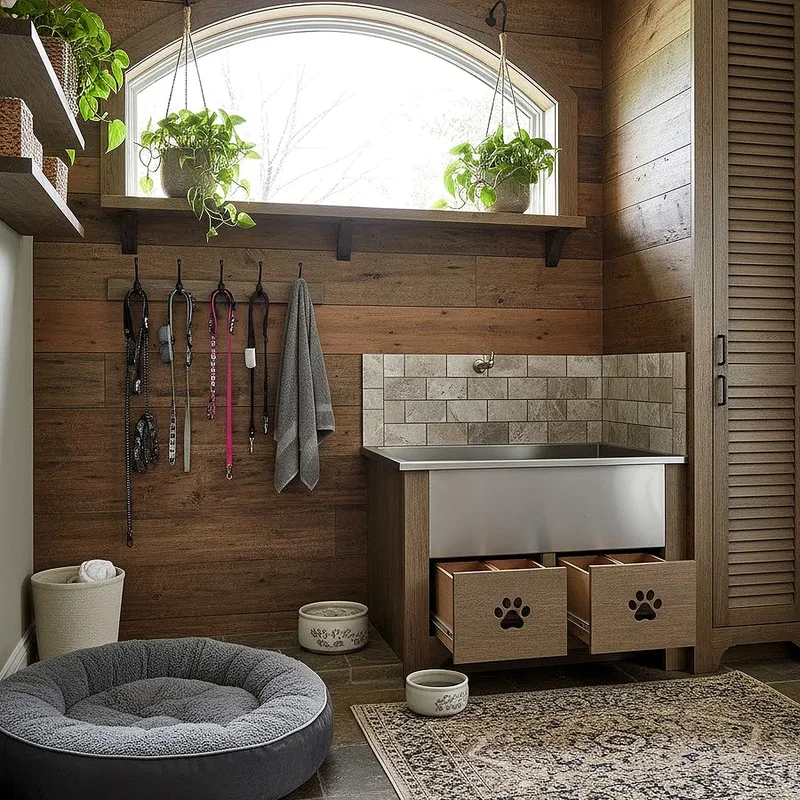 Your mudroom already handles dirty shoes and wet umbrellas, so why not make it your dog's command center too? Create a comprehensive dog station with hooks for leashes, shelving for supplies, and a comfortable bed area where your pup can dry off after outdoor adventures. Install a low shower head for quick paw washes and add storage baskets for toys, grooming supplies, and towels. This multifunctional space becomes the perfect transition zone between outdoor playtime and indoor relaxation. Consider adding a small bench above the dog bed area for humans to sit while removing shoes, creating a shared space that serves the whole family's needs.