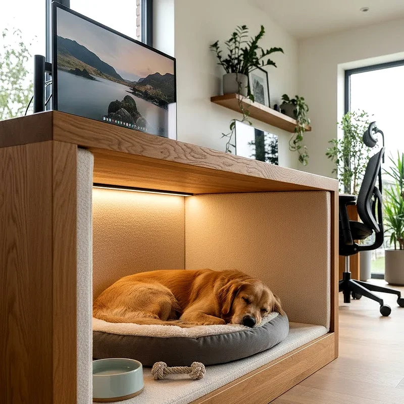 Working from home becomes even better when your furry coworker has their own office space! Create a dedicated nook under or beside your desk where your dog can stay close without disrupting video calls. Choose a bed that fits perfectly in the designated area and add a small toy basket for quiet entertainment options. This setup reduces separation anxiety while maintaining professional boundaries during important meetings. Consider installing a small fan for air circulation and a soft mat to protect your flooring. The proximity keeps your pup content while you work, and those quick pet breaks between tasks become instant stress relievers for both of you!
