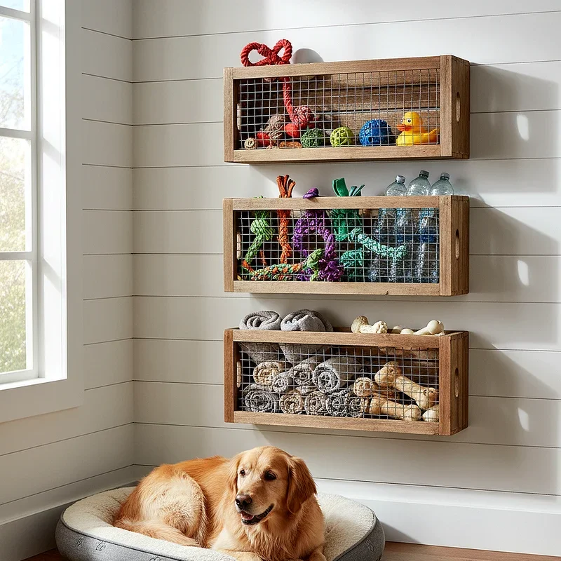 Hanging mesh organizers borrowed from bathroom and closet organization systems work surprisingly well for dog toys. These transparent storage solutions allow you to see contents at a glance, eliminating the frustration of searching through opaque containers for a specific toy. The breathable mesh material prevents moisture buildup that can occur with sealed containers, keeping toys fresher between uses. You can hang these organizers on the back of doors, inside closets, or on dedicated hooks in your mudroom or laundry area. The multiple pockets help you categorize toys by type, size, or which dog they belong to if you have multiple pets. This system works especially well for households with limited floor space or those seeking to keep toys completely out of sight when not in use. The lightweight design makes repositioning simple whenever you rearrange your spaces.