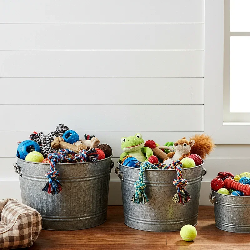 Galvanized metal bins bring industrial chic style to pet organization while offering exceptional durability. These rugged containers stand up to scratching, chewing, and rough handling that might damage softer storage options. The metal construction makes them easy to wipe clean, which proves invaluable when muddy toys come in from outdoor play sessions. Many galvanized bins feature convenient handles for easy transportation between indoor and outdoor spaces. Their neutral metallic finish coordinates beautifully with both modern and rustic design schemes, making them versatile additions to any room. You might place a large galvanized tub near your back door for outdoor toys or use smaller buckets throughout your home for different toy categories. The substantial weight of metal containers prevents them from tipping over when enthusiastic dogs dive in searching for their favorite squeaker.