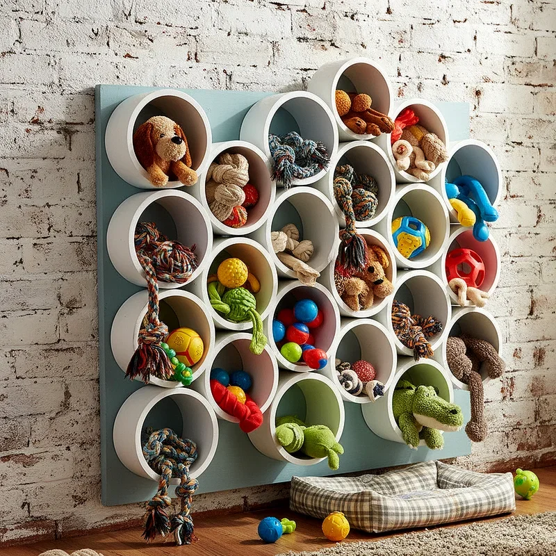 Creative DIYers can construct custom storage solutions using PVC pipes cut to various lengths and mounted on boards or walls. This innovative approach creates individual slots perfectly sized for balls, rope toys, and other cylindrical items. The open-ended design allows toys to drop through easily, making cleanup a breeze even for young children helping with chores. You can paint PVC pipes any color to match your decor or leave them white for a clean, modern appearance. This project costs relatively little compared to purchasing pre-made organizers, making it budget-friendly for families watching expenses. The modular nature of PVC construction means you can start small and expand your system as your toy collection grows. Mounting the organizer at an angle creates a gravity-fed dispenser where balls roll to the bottom, combining function with interactive appeal that dogs find entertaining.