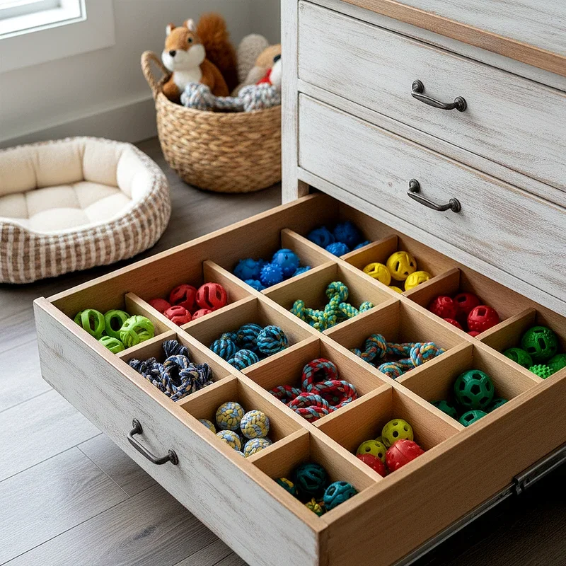 Small dog toys like balls, rope toys, and treat-dispensing puzzles often get lost in large storage containers, making drawer dividers an ingenious organizational solution. Dedicating a drawer in your living room console, kitchen island, or mudroom built-ins to pet supplies keeps small items sorted and easy to locate. Adjustable dividers let you customize compartment sizes based on your specific toy collection, creating logical categories that make sense for your household. This approach works especially well for toys with small parts that might otherwise disappear into the depths of larger bins. The closed drawer keeps toys dust-free between uses and maintains a cleaner appearance in your living spaces. You can line drawers with washable mats to protect the interior from scratches and make cleaning simple. This method particularly appeals to people who prefer completely concealed storage that doesn't advertise pet ownership to guests.