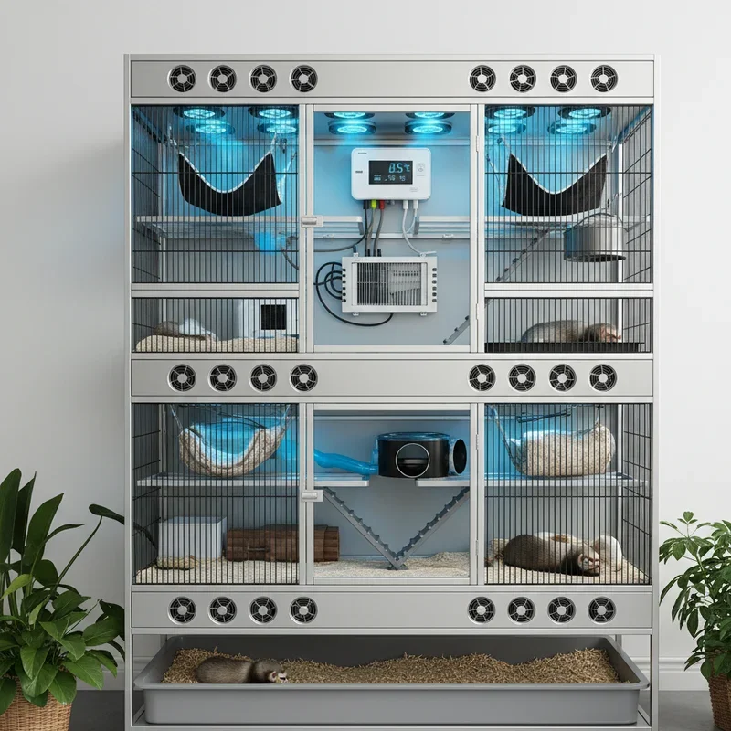Optimize your ferret's environment with proper ventilation and temperature control systems that maintain comfort throughout changing seasons. Position cages away from direct sunlight, heating vents, and air conditioners that create uncomfortable temperature extremes. Install small battery-operated fans for summer circulation, ensuring airflow without creating drafts that stress ferrets. Maintain temperatures between 60-70°F (15-21°C) for optimal ferret comfort, using ceramic heat emitters for winter warmth if needed. Avoid enclosed plastic cages that trap humidity and odors; wire cages provide superior ventilation for respiratory health. Monitor humidity levels, aiming for 40-60% to prevent both respiratory issues and excessive dryness. Create shade zones using fleece covers or platforms where ferrets can escape bright lights or warm spots.