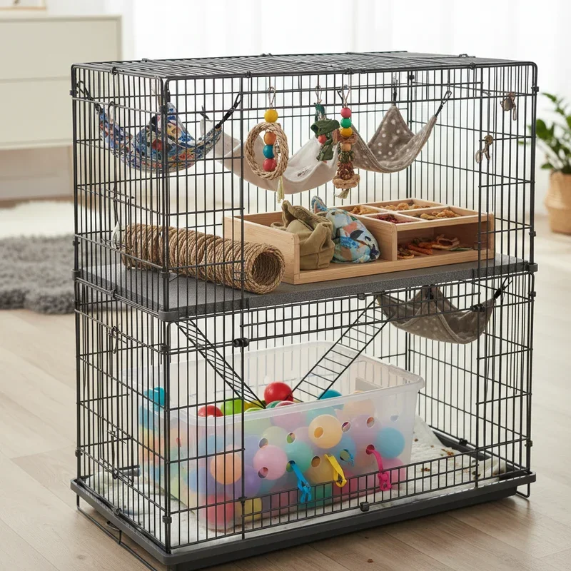 Choose and modify cage accessories for maximum ease of cleaning, making daily maintenance less of a chore while ensuring hygiene. Select smooth, non-porous materials like plastic or sealed wood that wipe clean easily without harboring bacteria. Avoid fabric items with complicated stitching or crevices where debris accumulates and odors develop. Design removable floor panels that lift out completely for thorough weekly deep cleaning sessions. Install corner guards and splash guards around messy areas like food stations and litter boxes. Use dishwasher-safe bowls and toys that sanitize easily in hot water cycles. Create modular setups where entire sections can be removed, cleaned, and replaced without dismantling the entire cage. Quick-release clips and ties speed up disassembly for maintenance.