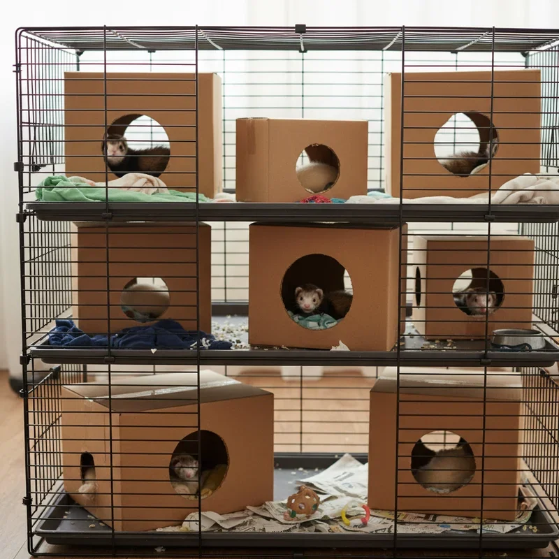 Craft inexpensive, replaceable hideouts using cardboard boxes that ferrets absolutely love for playing, hiding, and napping. Cut multiple entrances and windows in boxes to create fun exploration opportunities and prevent ferrets from feeling trapped. Stack boxes to create multi-story cardboard condos that can be easily reconfigured when ferrets get bored. Use only plain cardboard without staples, tape, or glossy coatings that could harm curious nibblers. Replace boxes regularly as they wear out or become soiled, making this an economical option for constantly fresh enrichment. Create themed designs like castles or mazes by connecting multiple boxes with cardboard tubes. These temporary structures satisfy ferrets' desires to explore new environments without permanent cage modifications.