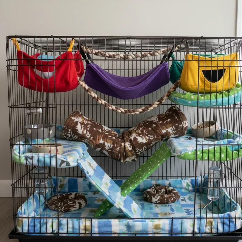 Revolutionize cage maintenance with custom fleece liners that provide comfort while simplifying your cleaning routine dramatically. Cut fleece to fit each cage level perfectly, creating absorbent, washable surfaces that protect cage floors from moisture and odors. Layer fleece over absorbent materials like U-haul blankets for superior absorption without the mess of loose bedding. Secure edges with clips or velcro to prevent ferrets from burrowing underneath and creating dangerous situations. Maintain multiple sets of liners for easy rotation during washing, ensuring ferrets always have clean surfaces. Choose fun patterns and colors that complement your home while hiding minor stains between washes. Fleece liners reduce waste compared to disposable bedding while providing a soft surface ferrets love to walk and sleep on.
