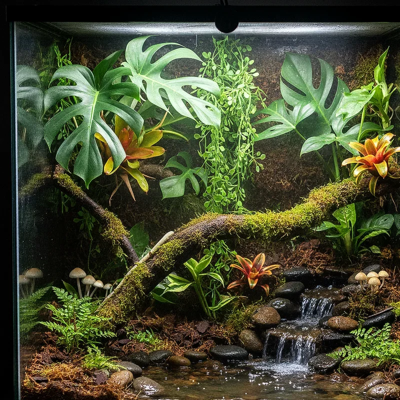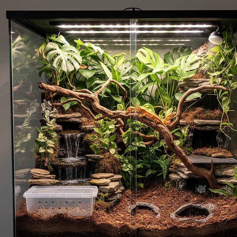 Transform your gecko's habitat into a lush tropical paradise perfect for crested geckos and day geckos who thrive in humidity. This setup requires live plants like pothos, bromeliads, and ferns that flourish in moist conditions while providing natural hiding spots. You'll need a quality misting system to maintain humidity levels between 60-80 percent throughout the day and night. Use coconut fiber substrate to retain moisture effectively while preventing mold growth with proper ventilation. Add multiple branches at various heights to create climbing opportunities that mimic their natural arboreal lifestyle. Include a waterfall feature or dripper system to encourage natural drinking behaviors and boost ambient humidity. The key lies in balancing moisture with adequate air circulation to prevent bacterial growth and respiratory issues. Your gecko will appreciate the naturalistic environment that encourages their instinctive behaviors and promotes overall wellbeing.