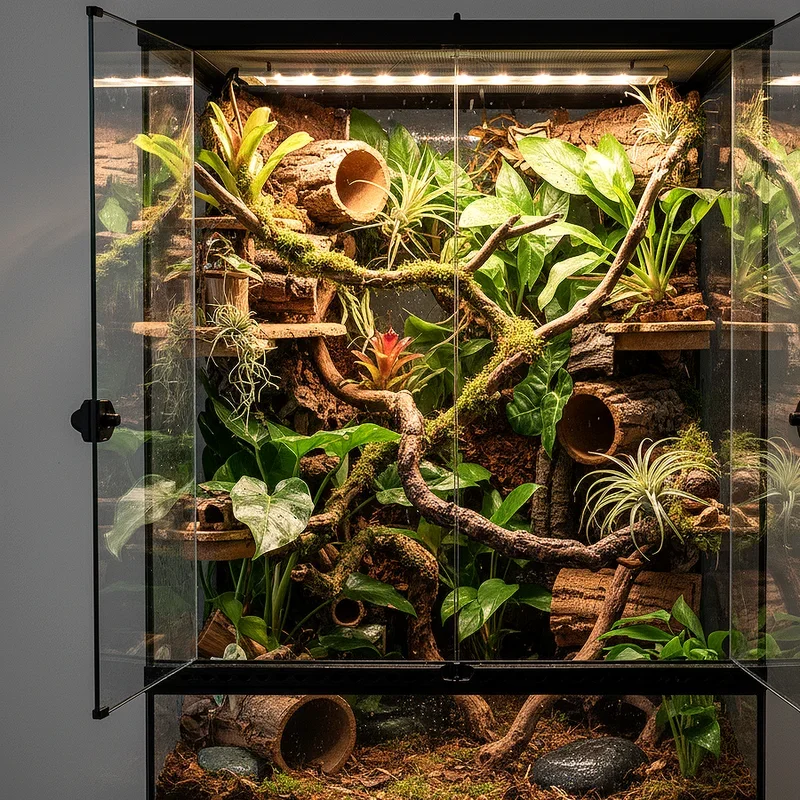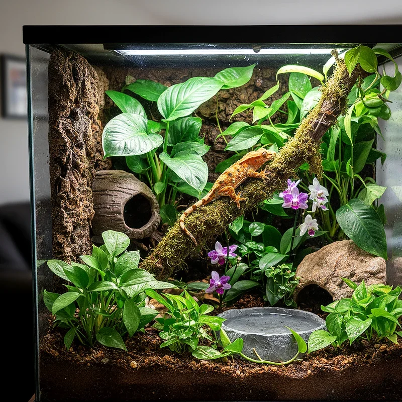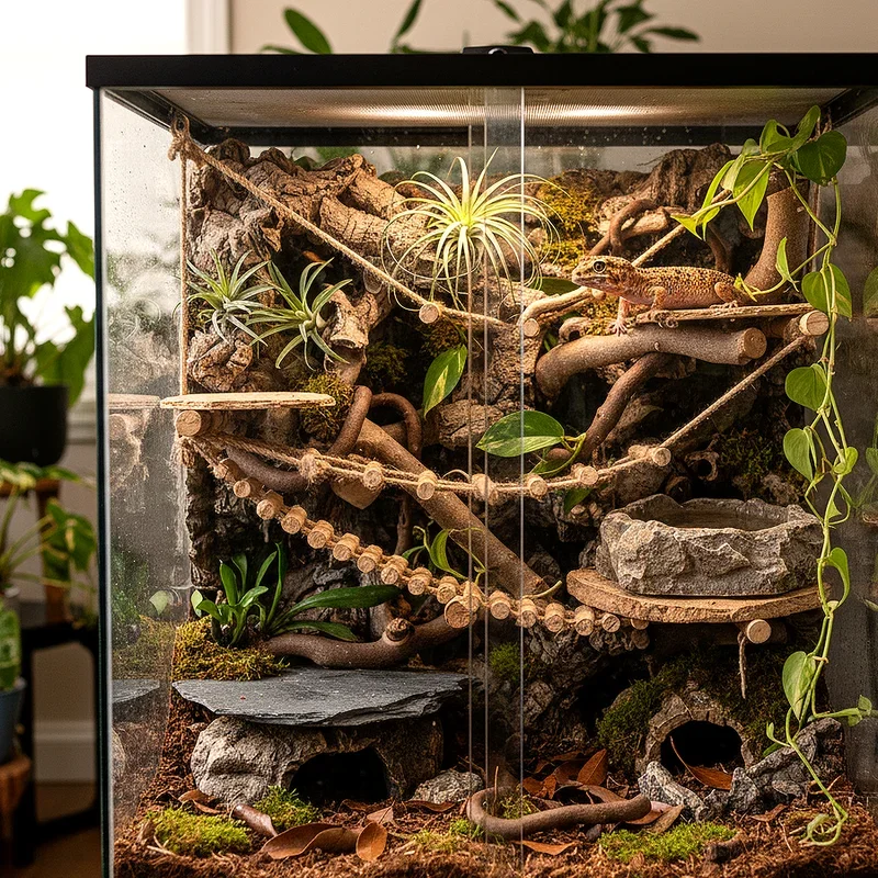 Arboreal gecko species like crested geckos and gargoyle geckos absolutely thrive in vertically oriented terrariums maximizing climbing space. Choose a tall enclosure measuring at least 18 inches in height to accommodate their natural climbing instincts properly. Install multiple branches, vines, and cork bark pieces at various angles to create an intricate three-dimensional climbing network. Position magnetic ledges at different heights where your gecko can rest while surveying their territory from elevated vantage points. Live plants like pothos can be trained to grow upward, creating natural pathways and additional hiding spots throughout. Ensure feeding ledges are positioned higher in the enclosure where arboreal species feel most comfortable dining. This vertical approach utilizes space efficiently while providing exceptional enrichment that keeps your gecko physically active and mentally stimulated daily.