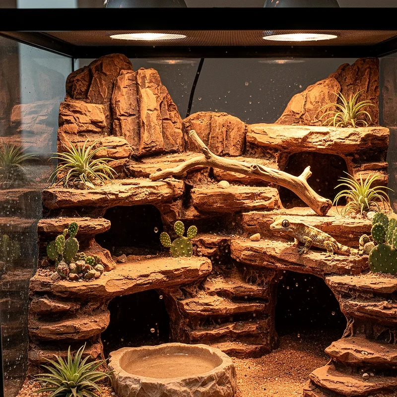 Recreate the dramatic beauty of rocky canyons to provide an engaging environment for terrestrial gecko species. Stack flat stones carefully to create caves, overhangs, and multiple levels that encourage exploration and natural behaviors. Use aquarium-safe silicone to secure heavier rocks, preventing dangerous collapses that could injure your curious gecko. Incorporate different rock colors and textures to add visual depth while creating distinct microclimates within the same enclosure. Add sand pockets between rocks where your gecko can dig shallow scrapes for temperature regulation or egg deposition. Position heat sources to warm specific rock surfaces, creating natural basking platforms that hold warmth effectively throughout the day. This setup provides exceptional thermoregulation opportunities as different surfaces retain varying amounts of heat, allowing precise temperature control. The rocky landscape offers mental stimulation through varied terrain while supporting natural behaviors in captive environments beautifully.