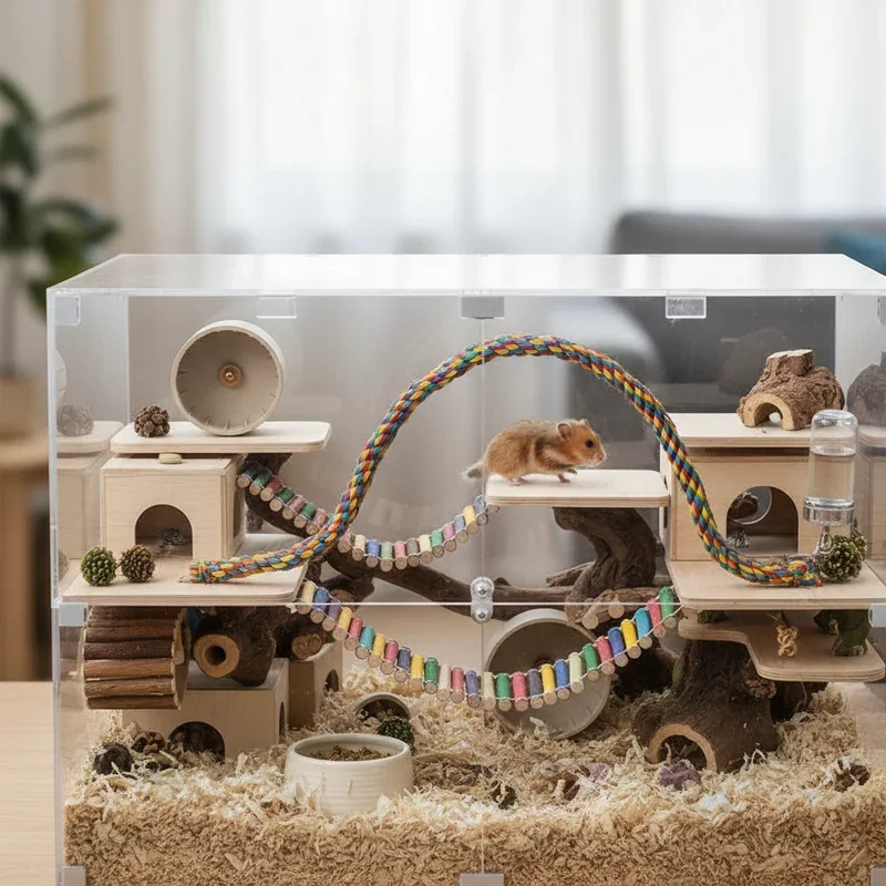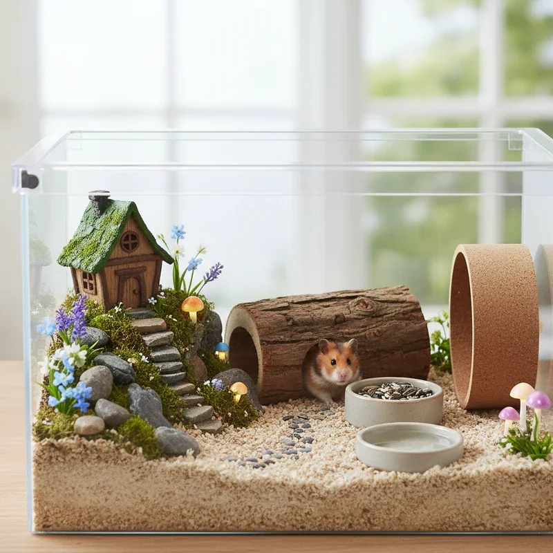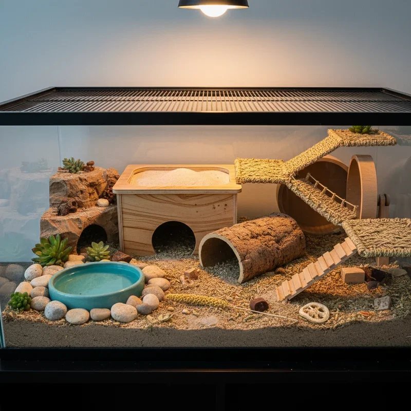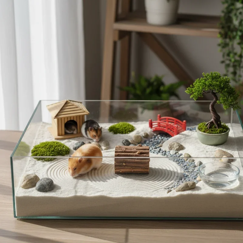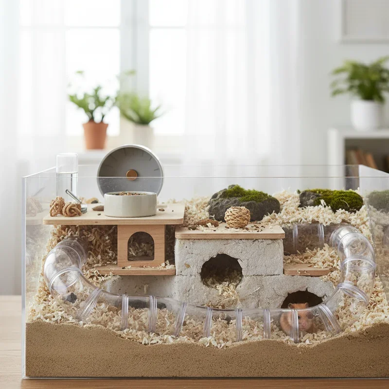 Design an arid landscape complete with sand, rocks, and desert-appropriate decorations! Create different sand depths for bathing and digging using chinchilla sand and play sand mixtures. Add terracotta pots as cool hiding spots mimicking desert clay formations. Include safe cacti replicas (soft fabric or rubber) for thematic decoration without prickly dangers. Use warm colors like oranges, reds, and yellows in accessories and bedding choices. Position a small water "oasis" surrounded by smooth stones. Add wooden platforms resembling desert rock formations for climbing and surveying territory. This theme works especially well for hamster species originating from arid regions. Your hamster experiences desert life without the extreme temperatures!