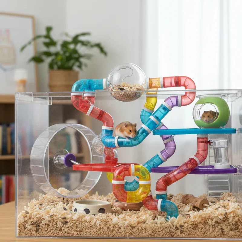 Design an elaborate network of colorful tubes that turns your hamster's cage into an exciting maze of tunnels! Connect multiple cages using various tube systems to create a hamster metropolis. Use transparent tubes in different colors so you can watch your pet navigate their plastic pipeline. Create junctions where tubes meet, offering route choices that keep exploration interesting. Include vertical tubes for climbing challenges and horizontal runs for speed racing. Add tube accessories like look-out chambers and rest stops where your hamster can pause during their journey. Regular tube rearrangement prevents boredom and maintains novelty. This setup particularly suits dwarf hamsters who love squeezing through tunnels. The tube city becomes an ever-changing playground that exercises both body and mind. Your hamster turns into a tiny explorer conquering their tubular kingdom!