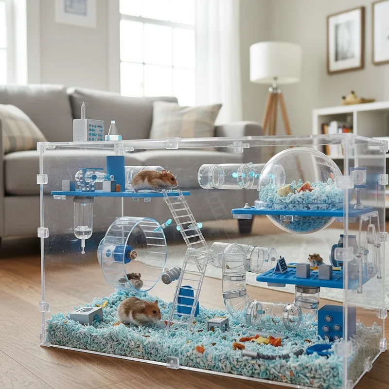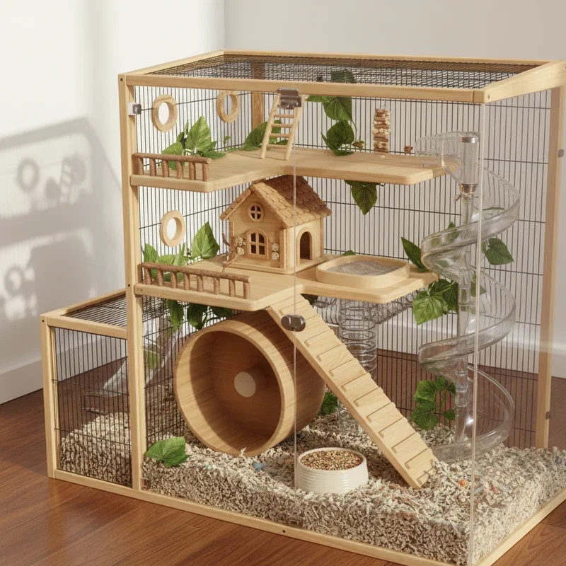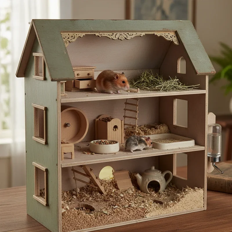 Transform the cage into a luxury hotel where your hamster is the permanent VIP guest! Create different "rooms" using dividers or separate chambers for various activities. Design a lobby area near the entrance with food and water stations. Include a fitness center with wheel and climbing equipment. Add a spa zone with sand bath and grooming supplies. Create suite-style sleeping quarters with premium bedding and multiple hideaways. Use small signs labeling different areas for humorous effect. Include room service by hiding treats in different locations daily. This theme makes routine care feel special and organized. Your hamster enjoys five-star accommodation every single day!