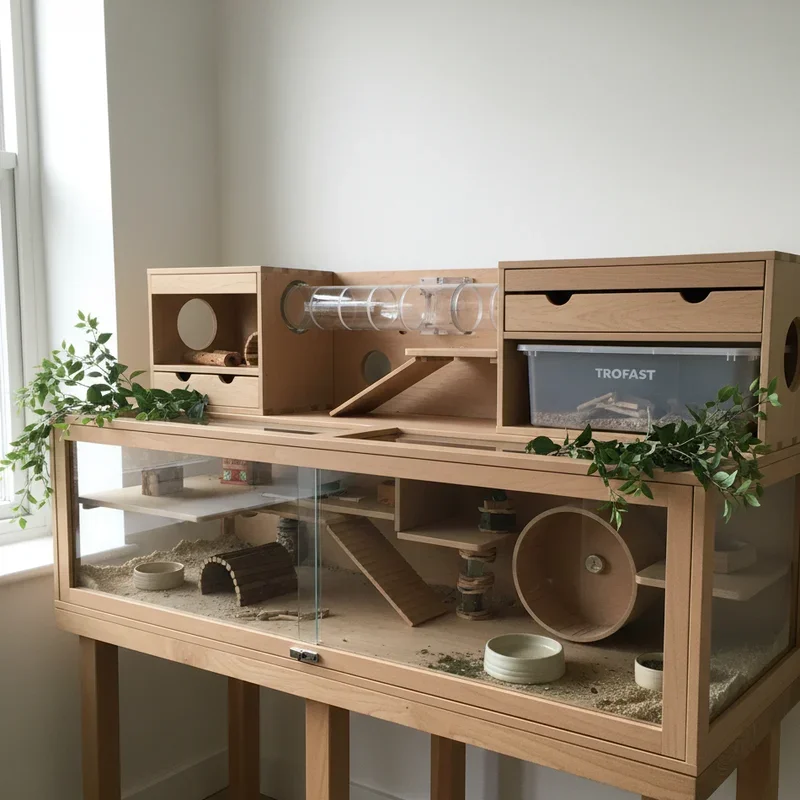 Use IKEA furniture pieces to create a customizable, expandable hamster habitat that grows with your needs! Start with DETOLF glass cabinets laid horizontally or LINNMON tables with added walls. Connect multiple units using DIY bridges or tube systems for expanded territory. The modular nature allows easy reconfiguration when you want change. Add SAMLA boxes as additional rooms or storage beneath the habitat. Use VARIERA shelf inserts as platforms within larger spaces. The clean IKEA aesthetic suits modern homes while providing practical hamster housing. Replacement parts are readily available and affordable when needed. This approach creates professional-looking habitats at fraction of specialty cage costs. Your hamster lives in Scandinavian style while you enjoy easy maintenance and customization!