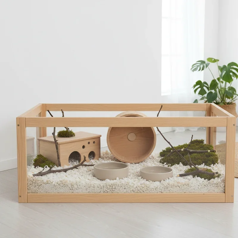 Bring the forest indoors with a woodland-themed habitat that mimics your hamster's natural environment! Use safe wood accessories like applewood sticks, willow bridges, and cork bark hides to create an authentic forest floor. Layer different substrates including paper-based bedding mixed with timothy hay and dried leaves for texture variety. Add preserved moss (hamster-safe) to corners for visual appeal and environmental enrichment. Include natural elements like smooth river stones, pinecones (baked to sanitize), and branches for climbing. This theme satisfies your hamster's instinctual needs while looking absolutely gorgeous. Position wooden houses to create a village effect among the "trees." The earthy colors and textures provide mental stimulation through different scents and surfaces. Your hamster experiences a slice of nature while staying safely indoors!