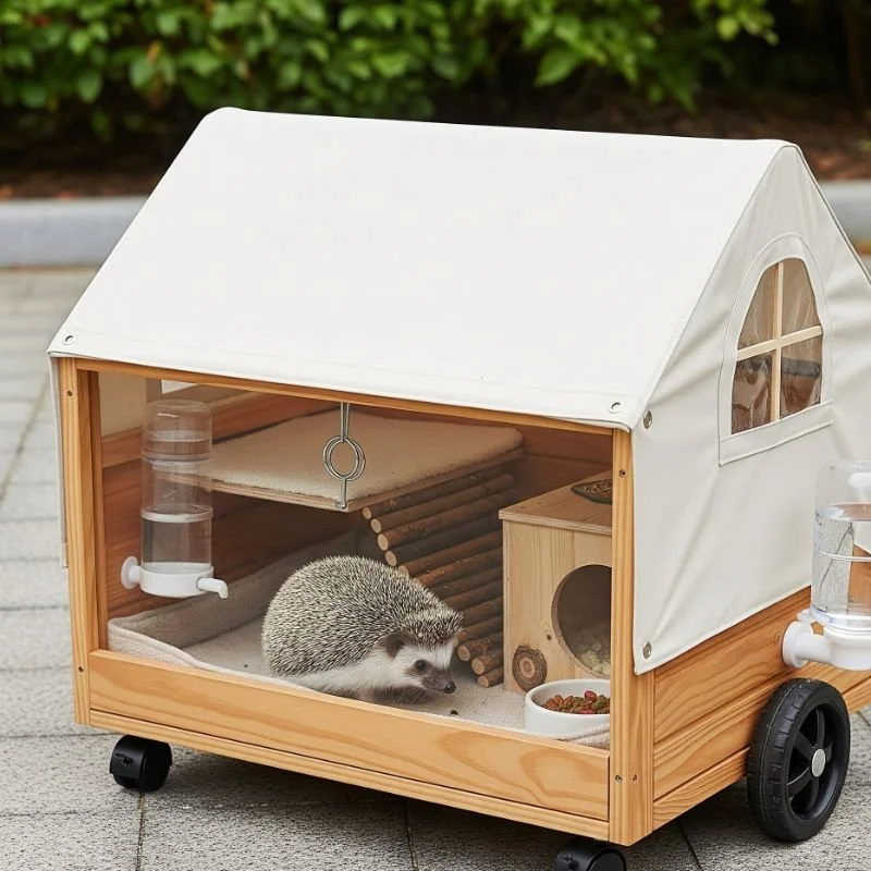 Design a cage that moves as easily as your lifestyle demands! Start with a collapsible wire playpen base that folds flat for transport. Use lightweight, modular components that pack efficiently: collapsible fabric hides, travel-sized wheels, and compact food dishes. Everything fits into a dedicated travel bag for quick setup anywhere. Include battery-powered heating options for temperature control on the go. The mobile design works perfectly for college students, frequent movers, or vacation adventures. Practice setting up and breaking down until it takes under 10 minutes. Include a travel first-aid kit and enough supplies for unexpected delays. This setup ensures your hedgehog maintains routine despite location changes. The portable nature doesn't sacrifice comfort or space when assembled. Your hedgehog adapts better to travel when their familiar items come along. The investment in quality travel gear pays off through reduced stress for everyone involved!