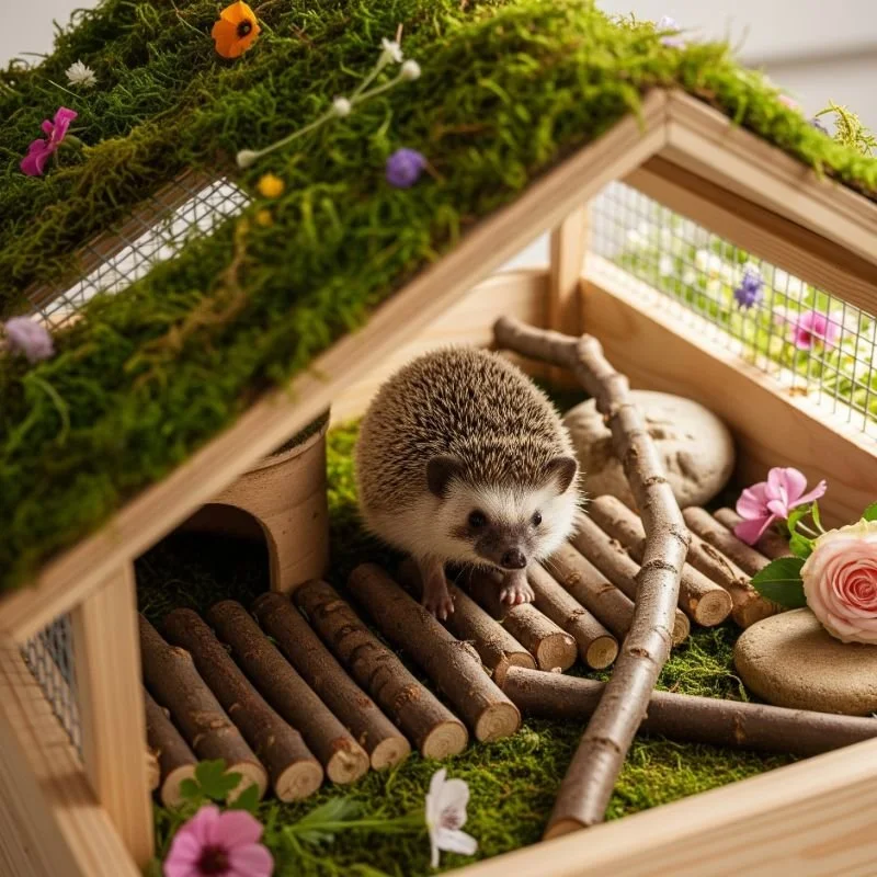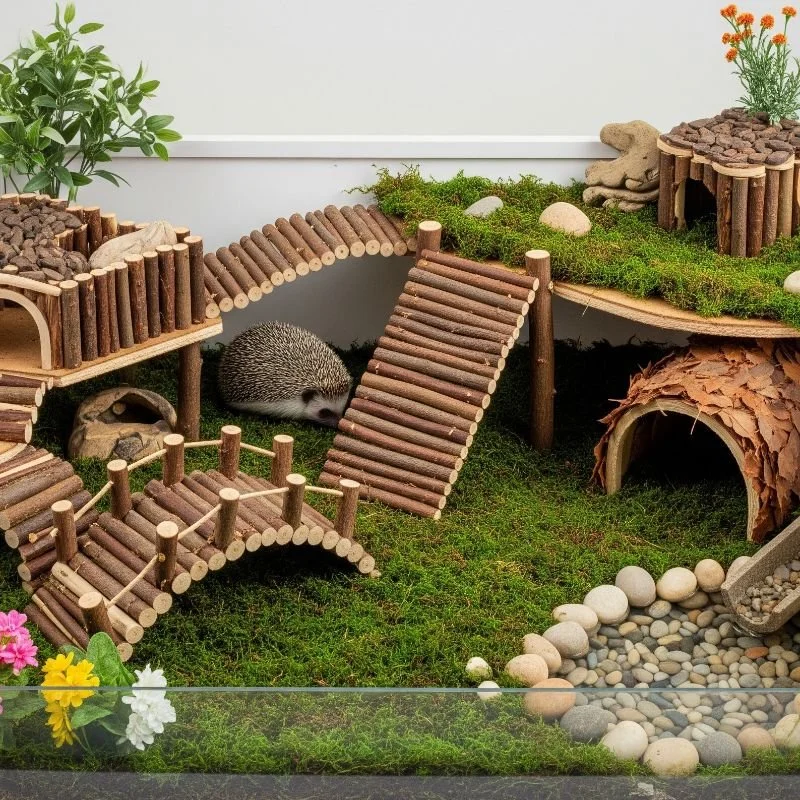 Bring the serenity of a garden into your hedgehog's habitat with this botanical-inspired design! Create raised garden beds using shallow containers filled with wheatgrass or cat grass for safe nibbling. Add artificial flowers and vines (thoroughly secured) for visual interest without toxicity concerns. Include a miniature greenhouse made from clear plastic containers for humid hide options. Design pathways using smooth river rocks bordered by fake moss. Install a small solar-powered fountain for ambient sound and occasional drinks. Use terracotta pots as unique hide options that naturally regulate temperature. The garden theme encourages exploration with different textures and heights. Add garden decorations like tiny gnomes or fairy doors for whimsical touches. This setup brings nature indoors while remaining completely hedgehog-safe. The green elements provide visual enrichment for both pet and owner. Regular "gardening" maintenance becomes part of the bonding experience with your spiky companion!