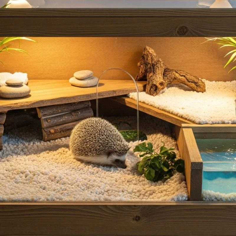 Bring the great outdoors inside with a forest-themed habitat that appeals to your hedgehog's wild instincts! Layer the bottom with bioactive substrate mixed with sphagnum moss, creating a naturalistic floor that actually helps control odors. Add real branches (properly sanitized), cork bark hides, and artificial plants to create a woodland wonderland. This setup encourages natural foraging behaviors as you scatter mealworms among the leaves. Include a shallow ceramic dish designed like a woodland pool for drinking and the occasional foot bath. LED grow lights on timers simulate natural daylight cycles, helping regulate your hedgie's internal clock. The earthy aesthetic looks stunning in any room while providing mental stimulation through texture variety. Use only hedgehog-safe plants like spider plants or pothos in secured pots. This living ecosystem practically maintains itself once established, making it perfect for busy hedgie parents who want an Instagram-worthy cage!