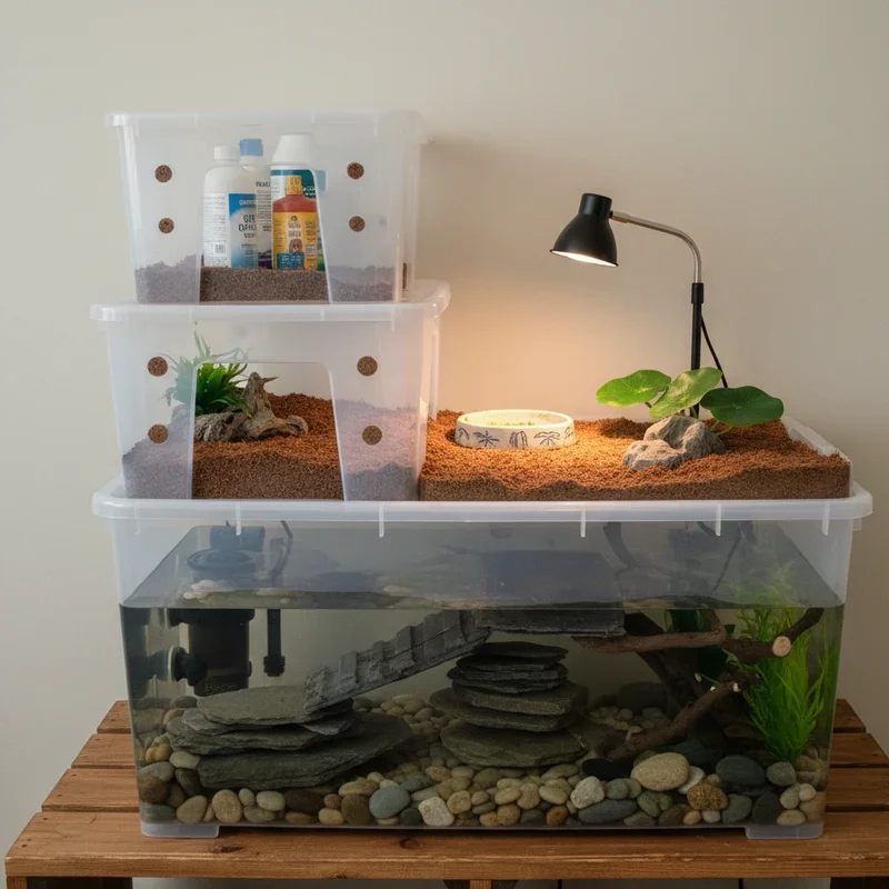 Create a multi-level turtle habitat using clear storage containers stacked and connected creatively! This modular system grows with your needs and available space. Cut openings between containers and connect with PVC tubes for turtle highways between levels. Each container can serve different purposes: swimming, basking, nesting, or feeding areas. Use waterproof sealant around connections to prevent leaks. The clear plastic provides 360-degree viewing while maintaining structural integrity. Add platforms at various heights for exercise and enrichment. This system works especially well for smaller turtle species or juveniles. Individual containers make cleaning and maintenance simpler than one large tank. Customize each level with different substrates, plants, or decorations. Your vertical turtle tower maximizes space usage in apartments or small rooms!