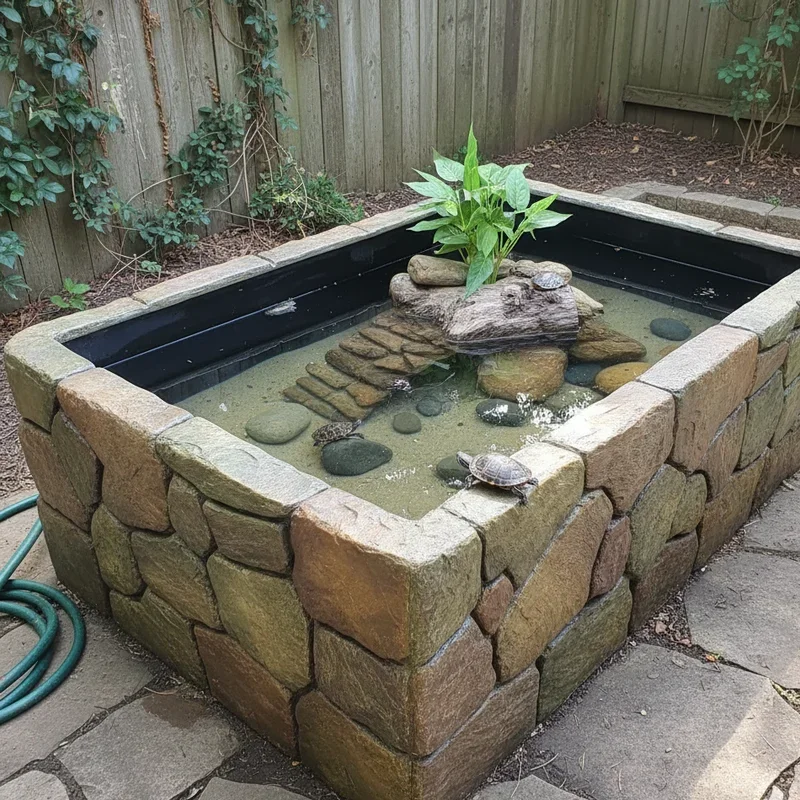 Stack concrete blocks to create a semi-permanent turtle pond that's virtually indestructible! This method works indoors with proper floor support or outdoors on level ground. Arrange blocks in your desired shape, filling cores with rebar and concrete for stability. Line the structure with thick pond liner, protecting it with underlayment fabric. The modular nature means easy size adjustments or relocation if needed. Build different levels using partial block heights for shallow and deep zones. The thermal mass of concrete helps maintain stable water temperatures. Add a wooden cap around the top edge for a finished look and comfortable leaning spot. Paint the exterior or face with stone veneer for enhanced aesthetics. This bomb-proof construction handles the largest turtle species with ease. Your DIY pond rivals professional installations at a fraction of the cost!