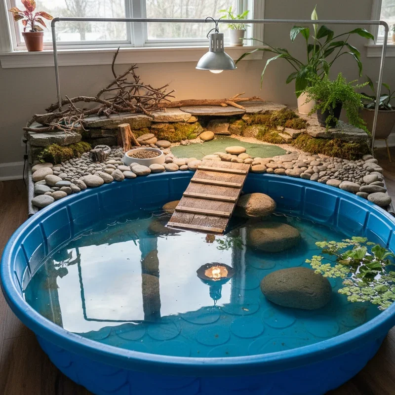 Bring pond life indoors with a hard plastic kiddie pool that gives your turtle room to really swim! These shallow pools work perfectly for species that prefer more horizontal swimming space than depth. Choose a rigid plastic model rather than inflatable for durability and easier maintenance. Place the pool on a waterproof tarp over sturdy plywood to distribute weight evenly. Create land areas using silicone-secured platforms or stack bricks to build permanent basking spots. The wide surface area makes filtration more effective and provides excellent gas exchange. Add aquatic plants in weighted pots for natural filtration and enrichment. The low walls make viewing and interaction easy while preventing escapes. Position grow lights overhead for plants and UVB for your turtle. This setup costs less than $100 but provides more swimming space than most commercial tanks!