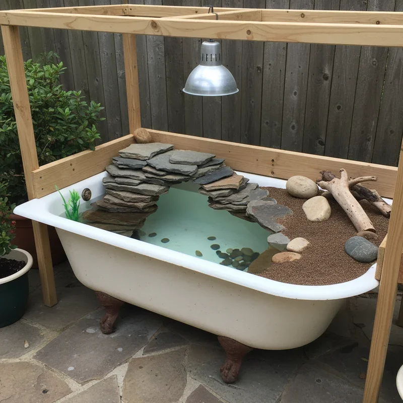 That old bathtub destined for the dump makes an incredible turtle habitat with minimal modification! Freestanding clawfoot tubs offer vintage charm while standard tubs provide practical functionality. The built-in drain makes water changes effortless compared to siphoning traditional tanks. Existing overflow prevents accidental flooding if you forget the hose. Build a platform over half the tub for a land area using egg crate and artificial turf. The smooth surfaces clean easily and resist algae growth. Position the tub near a window or add overhead lighting for basking and plant growth. Refinish the exterior to match your décor or leave the patina for character. Add a glass or acrylic panel across the front for better viewing if desired. This recycling project gives new life to old fixtures while creating unique turtle homes!