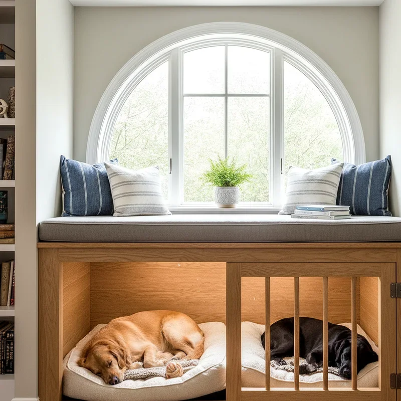 A window seat kennel combination transforms a sunny spot into a dual-purpose area where your dog can rest comfortably while enjoying natural light and outdoor views throughout the day. This design typically features a cushioned bench seat for humans above a kenneled area below, accessible through a side door or front gate. The elevation allows your dog to watch backyard activities, observe neighborhood happenings, and maintain visual connection with passing family members, reducing separation anxiety and boredom. Custom cushions in pet-friendly, washable fabrics coordinate with your room's color scheme while providing comfort for both species. Built-in storage drawers can house pet supplies, seasonal items, or general household goods. This creative solution particularly appeals to dogs with high social needs who thrive on environmental stimulation and observation opportunities.