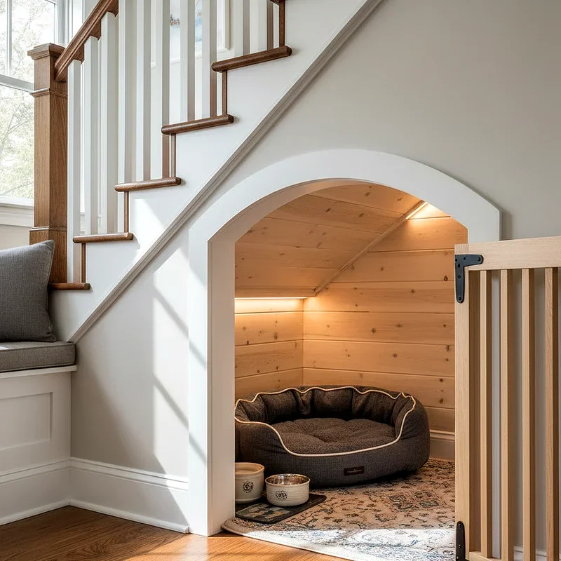 Transforming the often-wasted space beneath your staircase into a custom dog kennel represents one of the most creative uses of underutilized square footage in your home. This clever design approach maximizes functionality while maintaining your living area's flow and aesthetic appeal. You can install a stylish gate or door that matches your existing woodwork, creating a seamless integration with your home's architecture. The natural ceiling slope provides a cozy, den-like atmosphere that appeals to your dog's instinctual preferences for enclosed spaces. Add comfortable bedding, proper ventilation, and perhaps a small light fixture to create an inviting retreat. This solution works exceptionally well for medium to large dogs who need substantial space without dominating your main living areas.